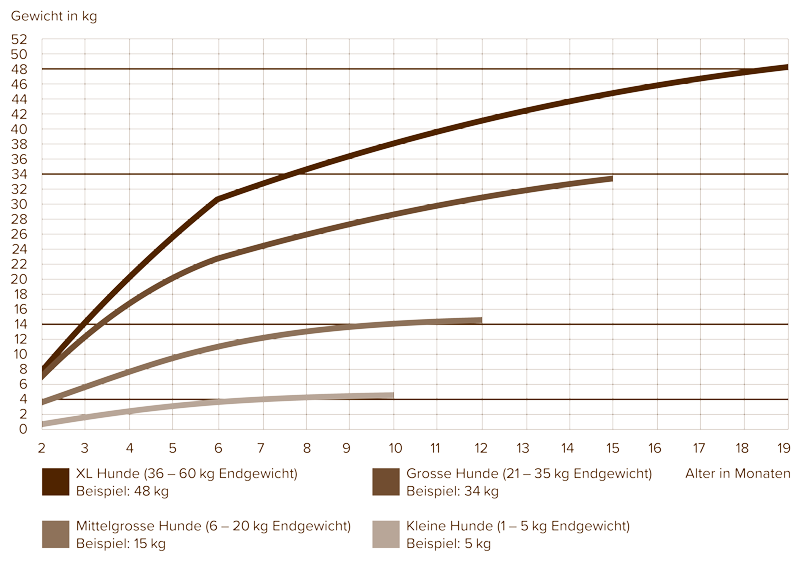 Grosse und Riesenrassen werden hingegen bis zu 100-mal schwerer: Ein Berner Sennenhundwelpe kommt mit rund 500 Gramm zur Welt und kann als ausgewachsener Hund stolze 50 kg erreichen. Dies lässt schon erahnen, dass besonders grosse Rassen auf ein gut entwickeltes, gesundes und stabiles Skelettsystem angewiesen sind. Gerade in der Entwicklung muss dieser Tatsache Rechnung getragen werden, und die Ernährung sollte den entsprechenden Bedürfnissen angepasst sein. Dies kann entweder durch die Ergänzung der herkömmlichen Nahrung für erwachsene Hunde oder durch spezielle Welpennahrung erfolgen.